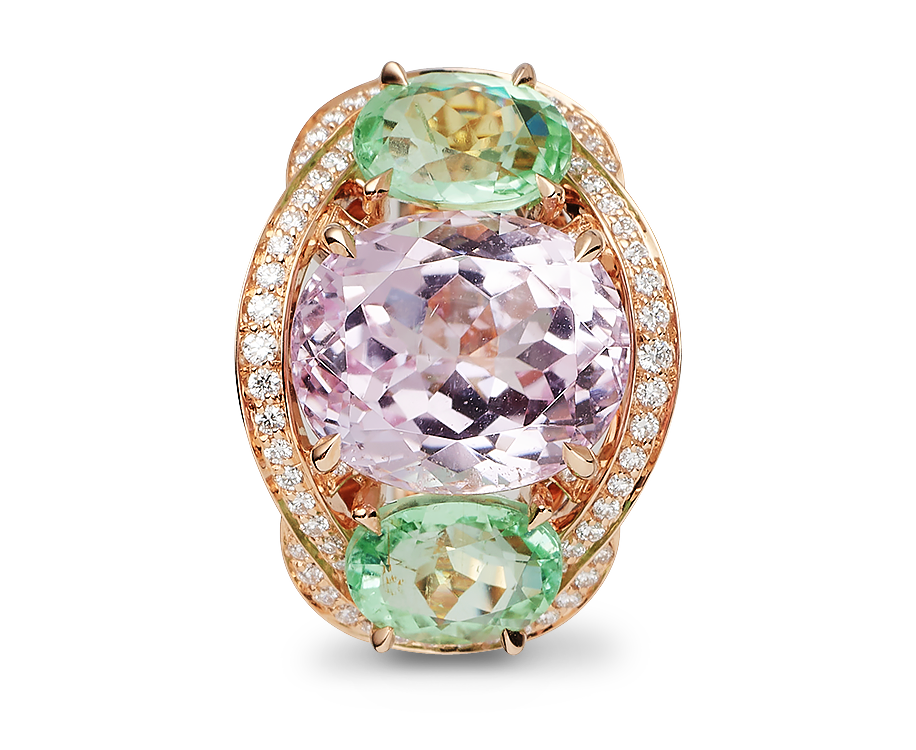 Heracles ring in pink gold set with an 8.40 carat oval-cut kunzite, 2 oval-cut green tourmalines for 3.59 carats and brilliant-cut diamonds.