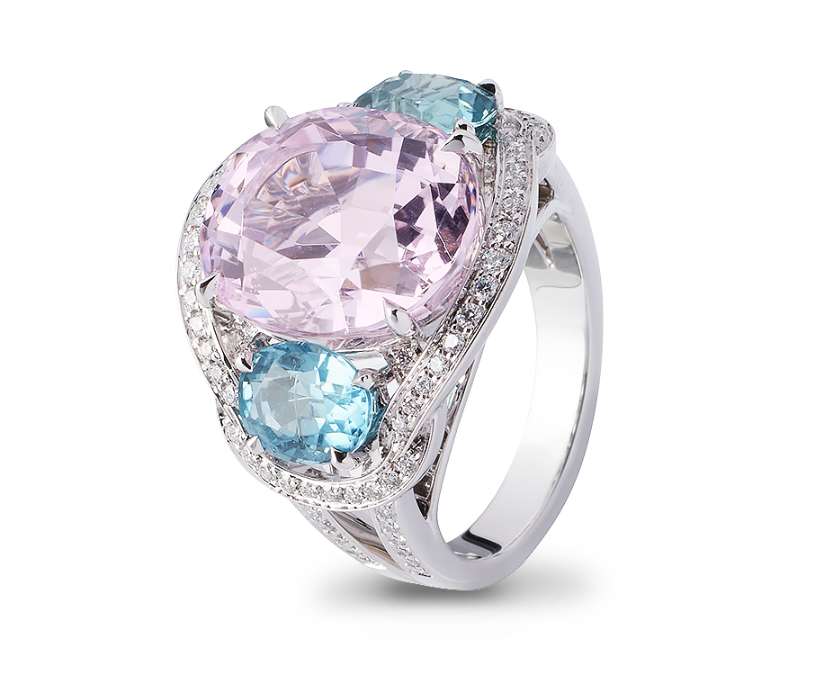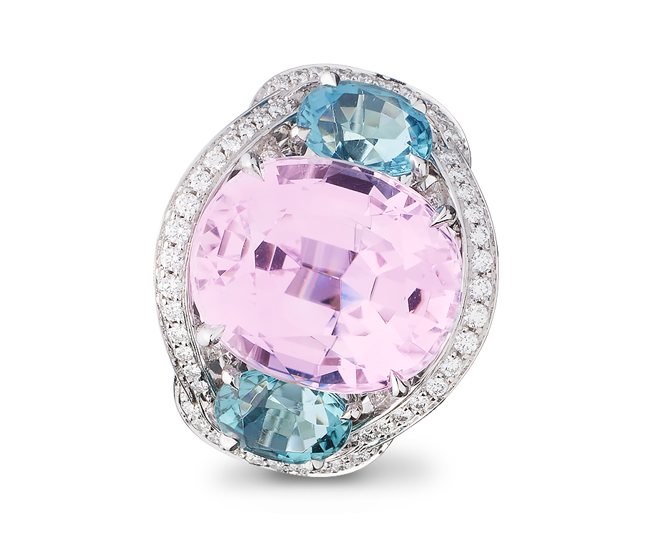 White gold Heracles ring set with a 10.35 carat oval kunzite, 2 oval-cut indigolite tourmalines for 2.36 carats and brilliant-cut diamonds.